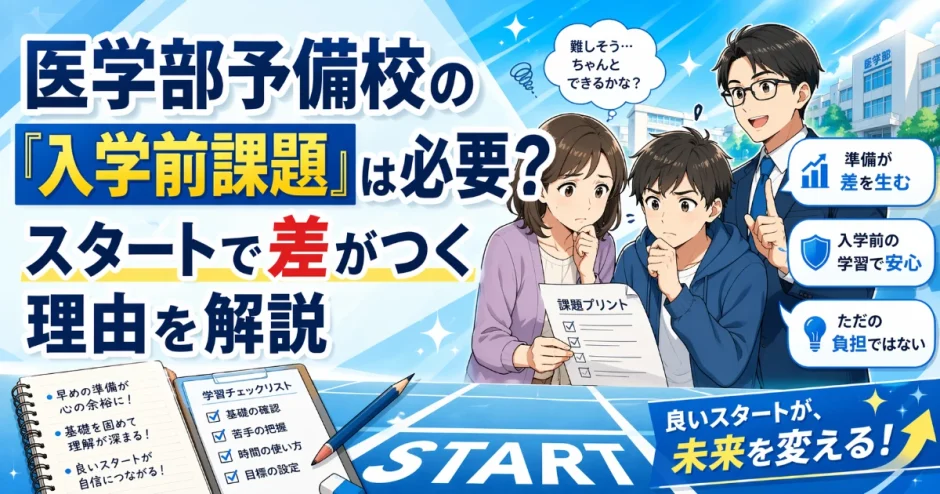 「予備校から入学前に課題を渡された。まだ通い始めてもいないのにこんなにやることがあるのか、と少し戸惑っている」「入学前課題を出す予備校と出さない予備校がある。この違いは何か、出す方が良いのか」「課題の量が多くて全部できる気がしない。やり切れなかったら初日から印象が悪くなるのでは」——入学前課題を巡るこうした疑問・不安は、医学部予備校への入学を控えた受験生・保護者から繰り返し出てきます。