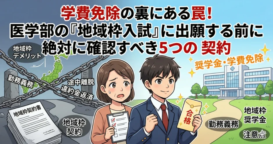 地域枠は「入りやすい入試」でも「お得な制度」でもありません。医師としての最初の10年間の働き方と場所を、入学前に決定する重大な契約です。この記事では、出願前に絶対に確認すべき5つの契約内容を、具体的なデータと実態を交えて解説します。