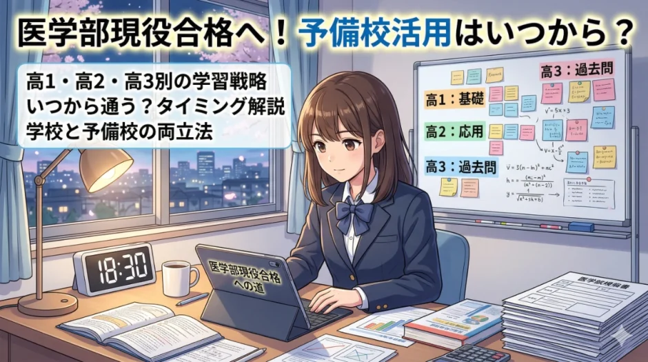 こうした高い要求水準を現役の3年間で達成するためには、「いつから始めるか」という問いへの答えが合否を大きく左右します。この記事では、高1・高2・高3それぞれの段階で何をすべきか、予備校はどのタイミングでどのように活用するのが効果的かを、学校との両立という視点も交えながら詳しく解説します。