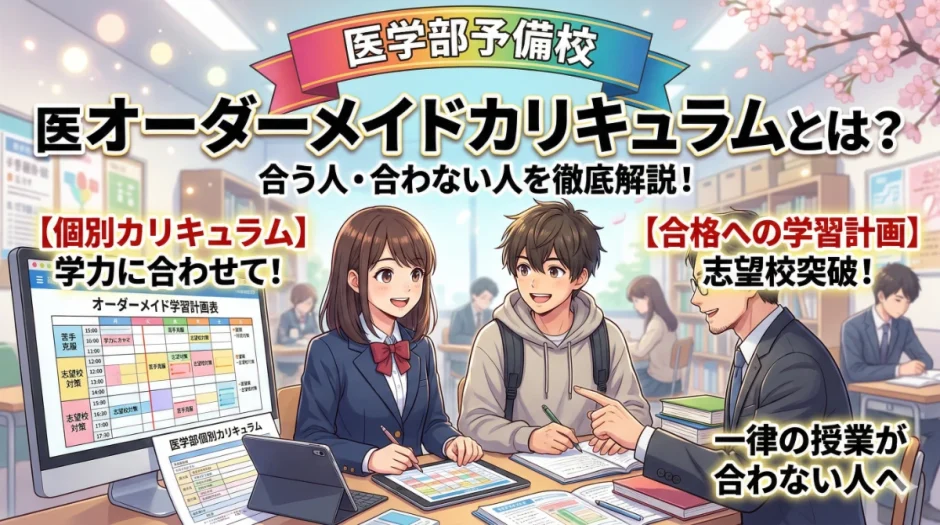 この記事では、医学部予備校におけるオーダーメイドカリキュラムの仕組み・集団型との違い・メリットとデメリット・向いている受験生・向いていない受験生の特徴・選ぶ際の確認ポイントを、資料請求前の比較段階にいる受験生・保護者にわかりやすく解説します。