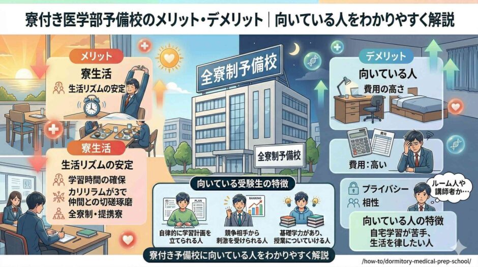 この記事では、寮付き医学部予備校のメリット・デメリット、全寮制と提携寮の違い、向いている受験生の特徴を正直に解説します。入寮を検討している浪人生・保護者の方はぜひ最後まで読んでください。