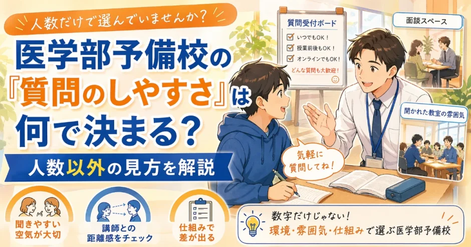 「少人数制だから質問しやすいはず」という期待を持って入塾したが、実際には質問しにくい雰囲気で、結局自分で調べることが多くなってしまった——こうした声は、医学部予備校に通う受験生から繰り返し聞かれます。