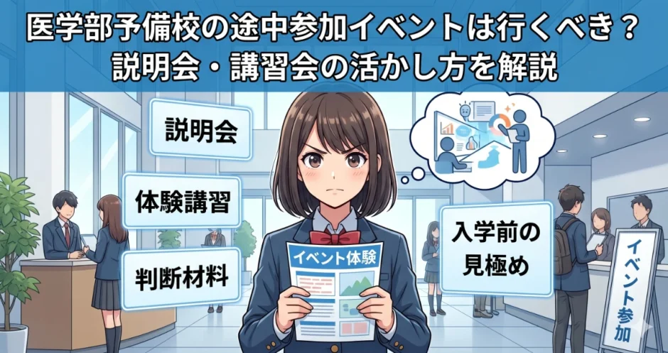 「入学を決める前に、もう少し雰囲気を見てみたい。説明会だけでも行ってみようか」「夏期講習だけ体験参加できると聞いた。入塾の判断材料になるのか、それとも時間の無駄になるのか」「説明会に行ったことがあるが、良いことしか言わないので正直なところが分からなかった」——予備校への本入学の前段階として、説明会・講習会・イベントをどう活用すべきか迷っている受験生・保護者は多くいます。
