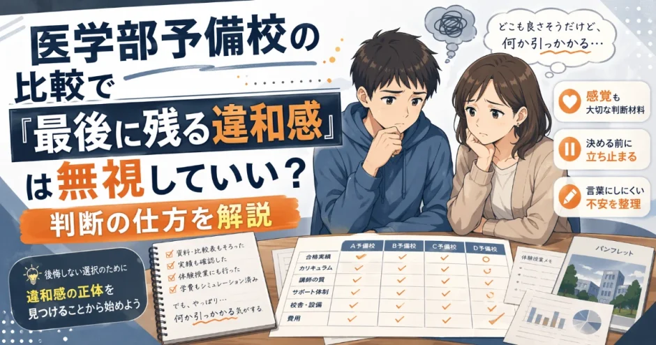 「雰囲気が違う気がするが、うまく言葉にできない」という状態のまま判断を下すことが最も後悔を生みやすいです。5つの確認軸でその感覚を言語化し、言語化した内容を「雰囲気評価シート」に記録することで、感覚は「データ」に変わります。そのデータを使って最終判断を下すことが、予備校選びの最後の迷いを正しく解消する方法です。