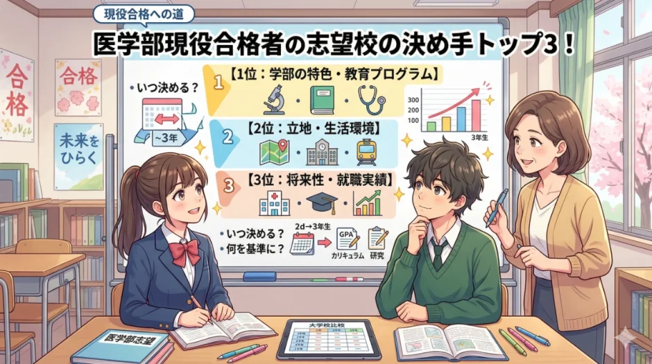 この記事では、医学部現役合格者が実際に志望校を決めるときに重視した決め手トップ3・志望校を決めるべき時期・失敗しない志望校選びの考え方・偏差値以外に考慮すべき要素を、データと具体的な視点で解説します。「志望校選びの正解がわからない」という方に、決断のための具体的な軸を提供します。