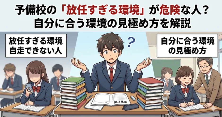 この記事では、自由度の高い予備校環境が機能するメカニズムと機能しないメカニズム・放任型環境が「危険」な受験生の特徴・放任型環境が「合っている」受験生の特徴・自分がどちらのタイプかを判断するための具体的な方法・管理の密度を見極めるための予備校選びの確認ポイントを解説します。