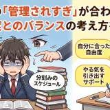 • 「自由度が足りないサイン(管理が多すぎる)」:担任の面談が負担に感じる・自分のペースを乱されている感覚がある・自分で考える前に担任の意見が来て受動的になっている