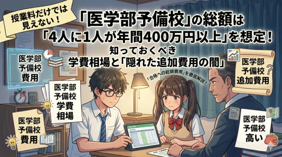 この記事では、医学部予備校の費用の実態・見えにくい追加費用の項目と金額の目安・予備校タイプ別の年間総額シミュレーション・後悔しない費用確認の方法を、入学前に総額を把握して判断したい保護者・受験生に向けて詳しく解説します。