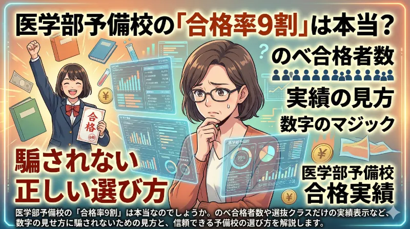 この記事では、医学部予備校の合格実績の表示方法に潜む「数字のマジック」の具体的な手法・数字を正しく読む方法・本当に信頼できる予備校を見極めるための判断ポイントを、保護者・受験生が騙されないための実践的な情報として解説します。
