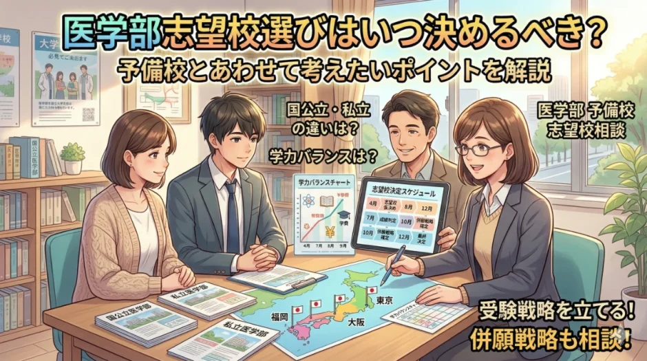 この記事では、医学部の志望校選びにおける重要な考え方・国公立と私立の違い・志望校をいつ・どのように決めるか・予備校と一緒に考えたい受験戦略のポイントを、受験生・保護者のどちらも納得できるよう丁寧に解説します。