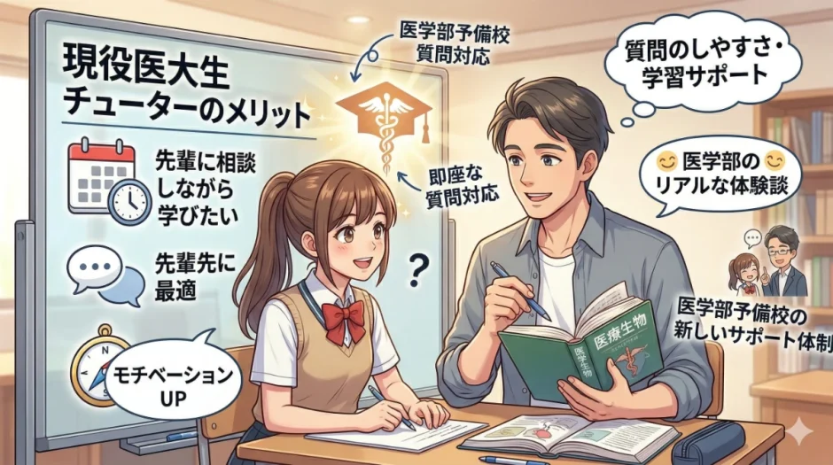 「授業は講師に任せるとして、日常的な質問や雑談ができる身近な先輩がいてくれたらどれだけ心強いか」——こうした声を持つ受験生にとって、現役医大生チューター制度は大きな魅力に映ります。