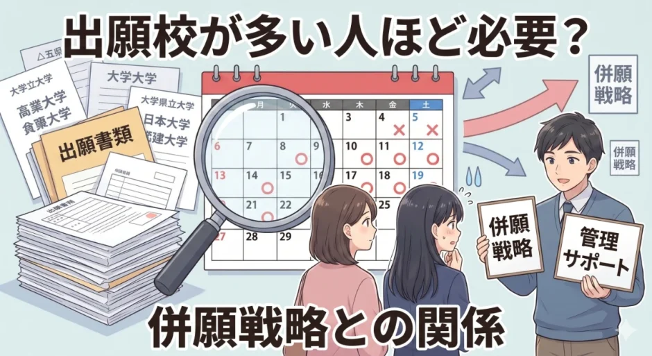 この記事では、複数校受験で生まれる3つの構造的な問題・出願戦略の設計で予備校が持つ情報的優位性・出願校数別の予備校サポートの必要性・自力管理が成立する条件と限界・受験費用の現実と「出願の質」の考え方を、実践的な視点から徹底的に解説します。