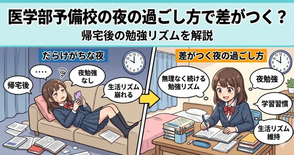 「予備校から帰ってきたら疲れていて、ご飯を食べたらもう何もできない状態になってしまう」「やろうとは思っているが、帰宅後にスマートフォンを触り始めると止まらなくなって気づいたら深夜になっている」「頑張って夜も勉強しようとするが、翌日の予備校で眠くなって授業が頭に入らない」——こうした状況に悩む受験生・保護者は、医学部受験の現場で非常に多くいます。