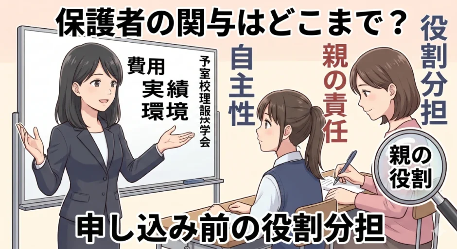この記事では、保護者が「関与すべき領域」と「任せるべき領域」の具体的な区分け・申し込み前に決めておきたい役割分担の内容・保護者の「過干渉」と「適切な関与」の境界線・費用決定という重大判断への保護者の責任の持ち方を、実践的に解説します。