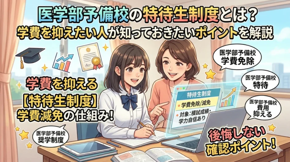 この記事では、医学部予備校の特待生制度の仕組み・対象になりやすい受験生の特徴・制度を活用するための準備・注意すべきポイント・費用を抑えながら質の高い指導を受けるための総合的な考え方を解説します。