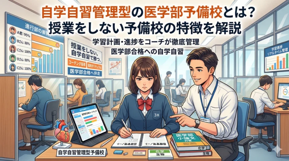 この記事では、自学自習管理型の医学部予備校の仕組み・授業中心型との違い・メリットとデメリット・向いている受験生の特徴を、できるだけ具体的に解説します。「授業を受けるだけでは伸びない」と感じている受験生・保護者の方にとって、新たな選択肢を検討するための材料としてお読みください。