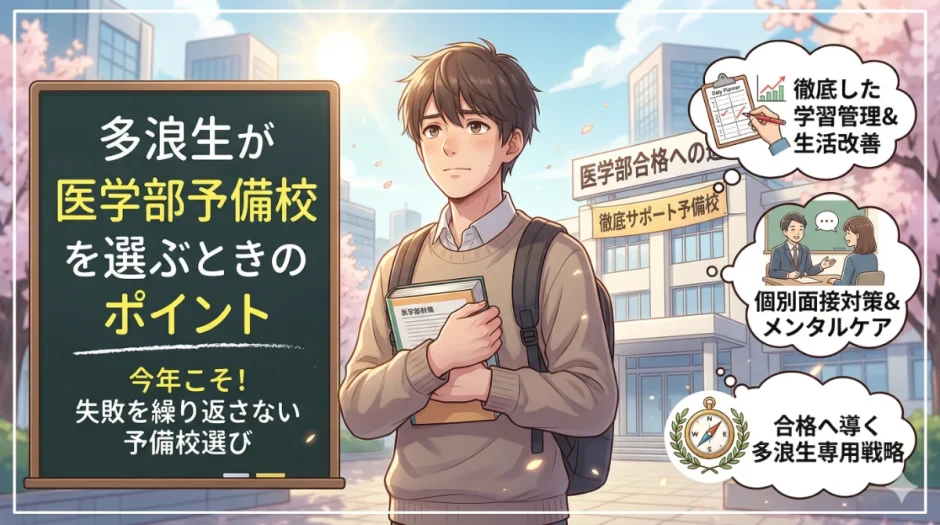 この記事では、多浪生が医学部合格を目指すうえで予備校選びにおいて重視すべきポイント・多浪生特有の課題への対処法・面接での年齢への対応を、過去の失敗を繰り返さないための視点から丁寧に解説します。