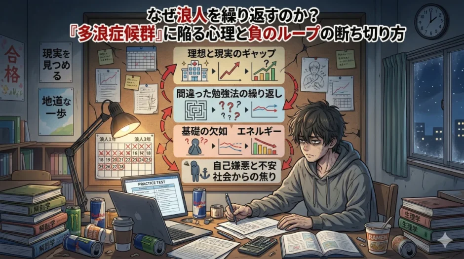 多浪状態に陥るのは、「努力が足りないから」でも「才能がないから」でもありません。多浪という状態には、それを生み出す明確な心理的・構造的な原因があります。その原因を正確に把握せずに「今年こそ頑張る」という精神論だけで挑むと、同じパターンが3浪・4浪と繰り返されます。