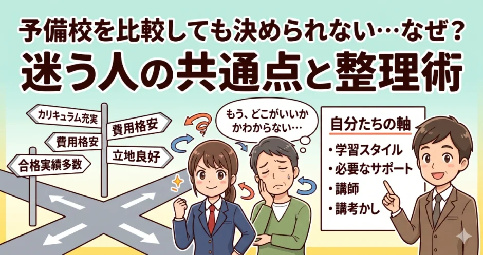 「費用・指導の質・管理の密度・通いやすさ・合格実績」のすべてで最高点を取る予備校は存在しません。「最も重要な条件で高いスコアを持つ予備校」を選ぶことが、完璧な予備校を探すことよりも現実的かつ効果的な意思決定です。